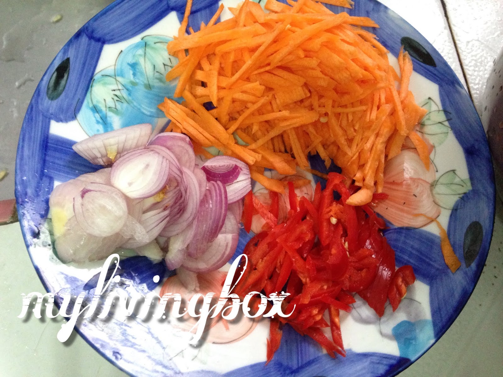 1. 把黄瓜去芯,切成约1.5寸条状。红萝卜和辣椒切丝。大葱头切成薄片。